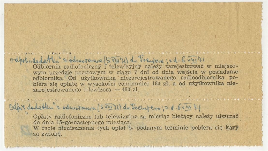 Bloczek dwóch pocztowych druków dowodów nadania przesyłek poleconych wypełnionych przez S.Krukowskiego - strona 2: tylna - na każdym pasku notka S. Krukowskiego - "Odpis "dodatku" z odwołania (5 VIII 71) do Premiera; z d. 6 VIII 71"