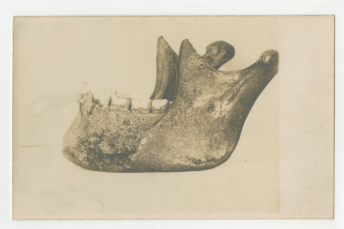 Czarnobiała fotografia przedstawiająca żuchwę - widok z profilu - awers.