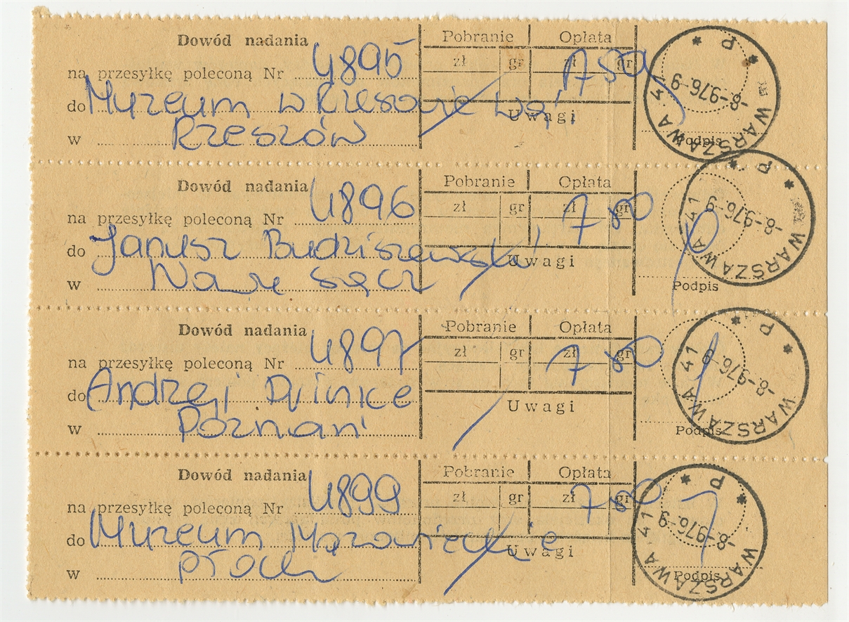 Cztery dowody nadania przesyłki poleconej z dn. 8 IX [19]76 r.