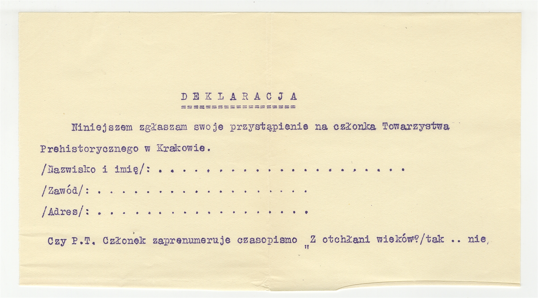 Deklaracja przystąpienia na członka Towarzystwa Prehistorycznego w Krakowie
