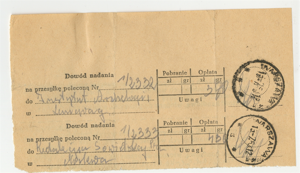 Element 1 - Dowód nadania dwóch przesyłek poleconych w dniu 15 .7. [19]63 roku do Leningradu i do Moskwy -awers