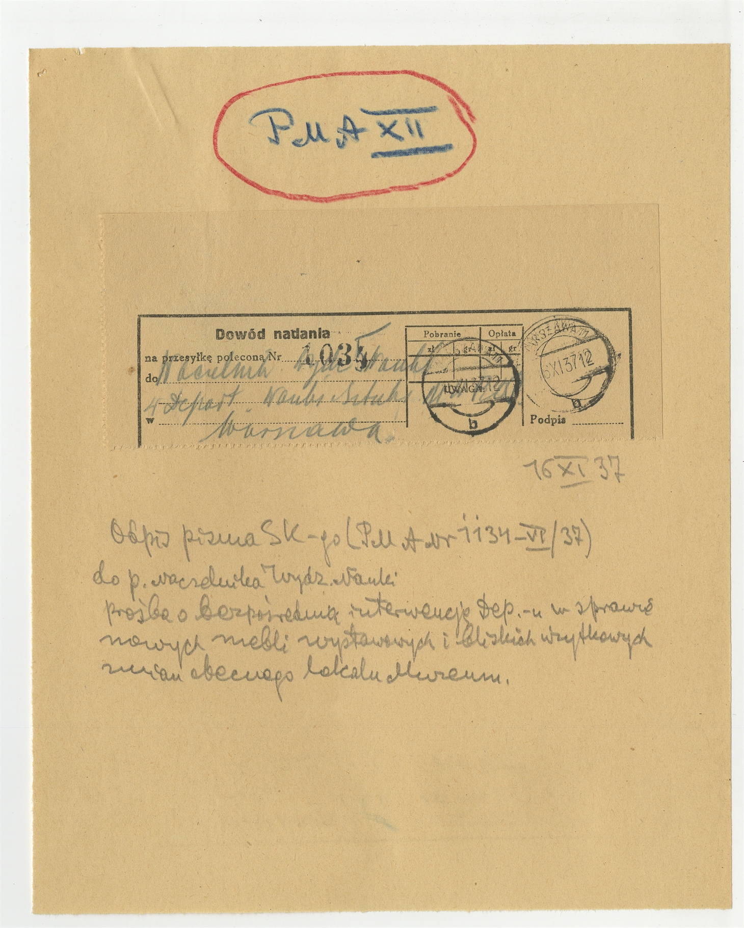 Dowód nadania listu (16 XI [19]37 r.) wraz z opisem: "Odpis pisma SK-go (PMA Nr 1134-VI/37) […] prośba o bezpośrednią interwencję Dep-u w sprawie nowych mebli […]"