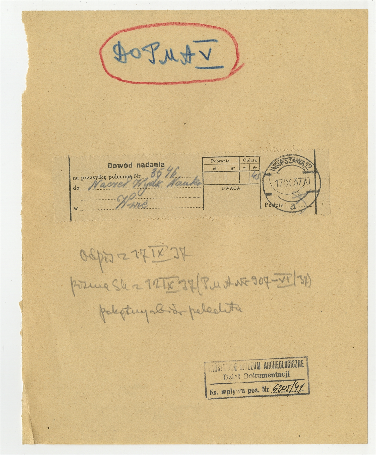 Dowód nadania listu (17 września [19]37 r.) wraz z opisem: "Odpis z 17 IX 37 pisma (SK) z 12 IX 37 (PMA Nr 907-VI/37) pokątny zbiór paleolitu"