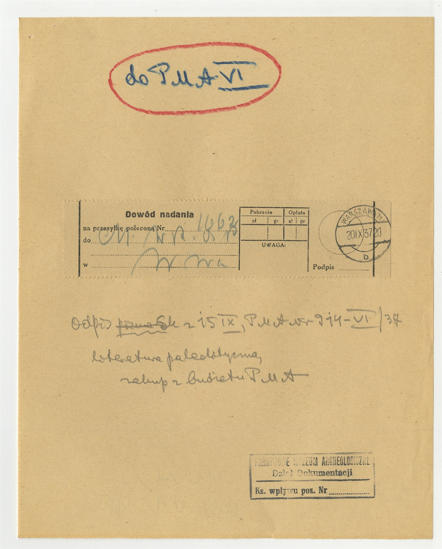 Dowód nadania listu (20 września [19]37 r.) wraz z opisem: "Odpis z 15 IX 37 PMA Nr 914-VI/37 literatura paleolityczna zakup z budżetu PMA"