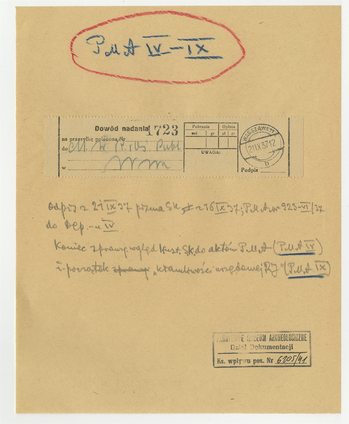 Dowód nadania listu (21 września [19]37 r.) wraz z opisem: "Odpis z 21 IX 37 pisma SK z 16 IX 37; PMA Nr 923-VI/37 do Dep-u IV koniec sprawy: wgląd kust. SK do aktów PMA […]"