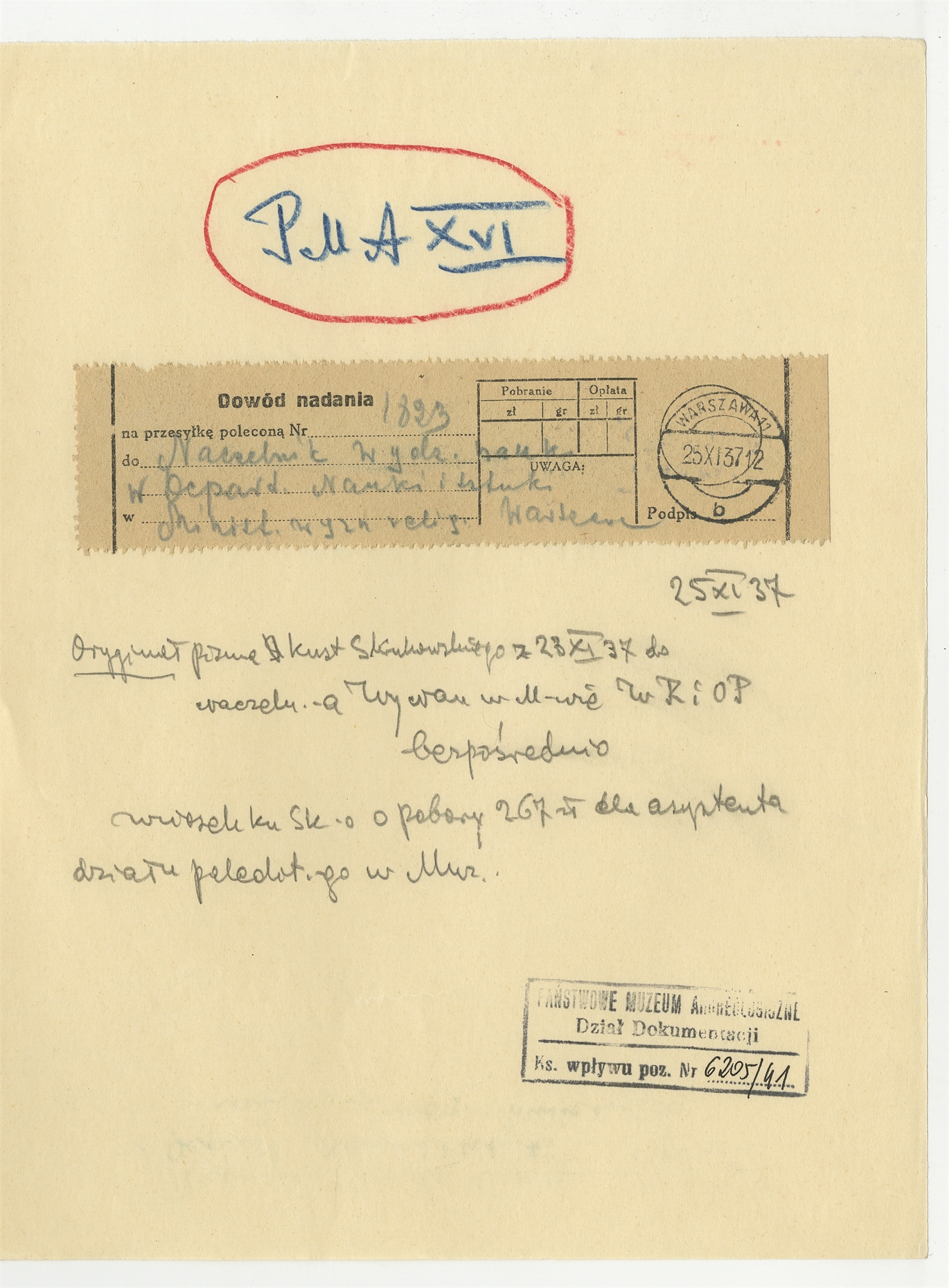 Dowód nadania listu (25 XI [19]37 r.) wraz z opisem: "Oryginał pisma kust. S. Krukowskiego z 23 XI 37 do p. Naczelnika […] wniosek ku SK o pobory 267 zł dla asystenta działu […]"