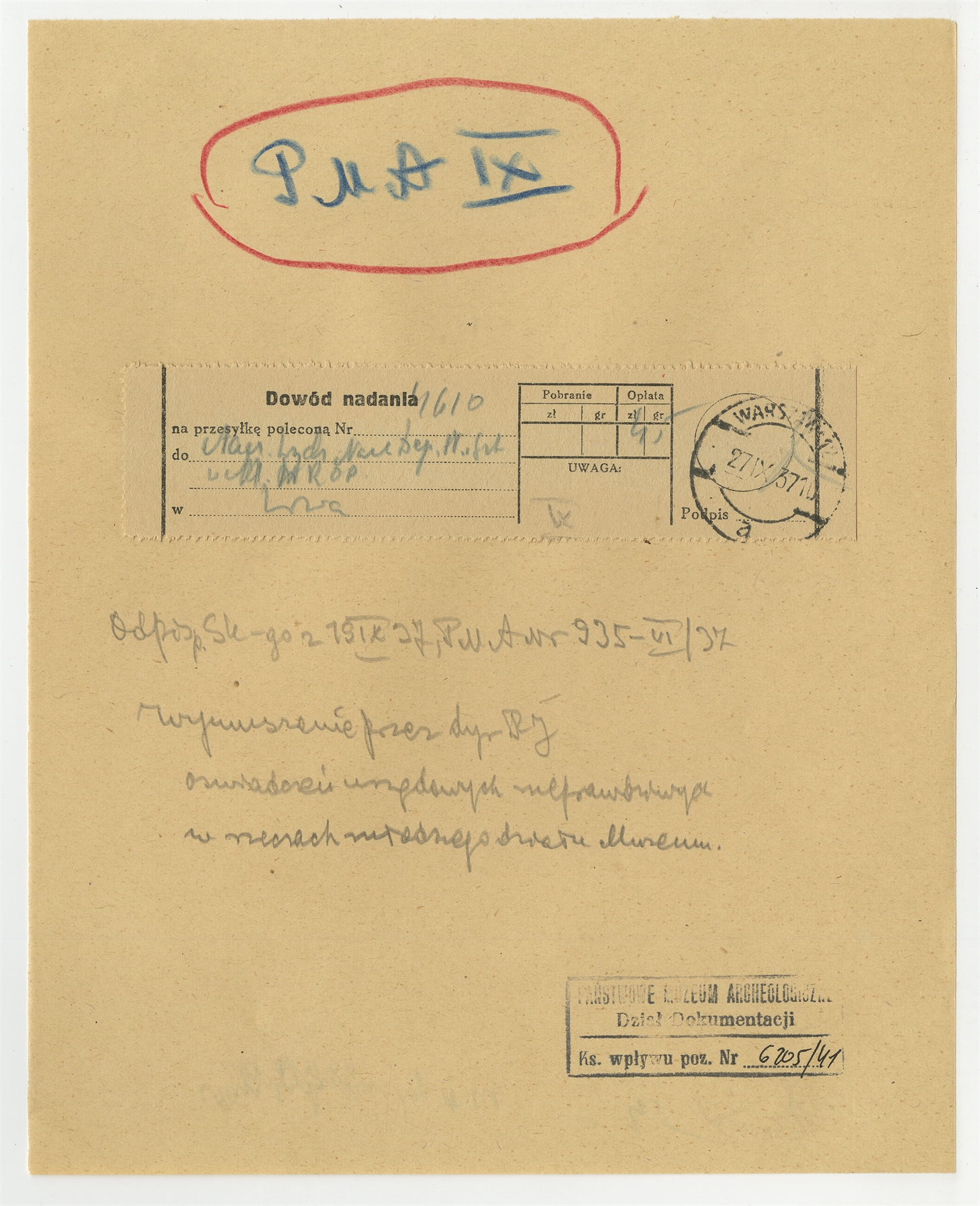 Dowód nadania listu (27 września [19]37 r.) wraz z opisem: "Odpis p. SK-ego z 19 IX 37 PMA Nr 935-VI/37 wymuszenie przez dyr. RJ […]"