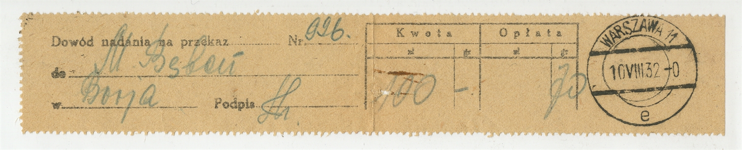 Dowód nadania przekazu pieniężnego dla M. Bębna z dnia 10 VIII [19]32 roku
