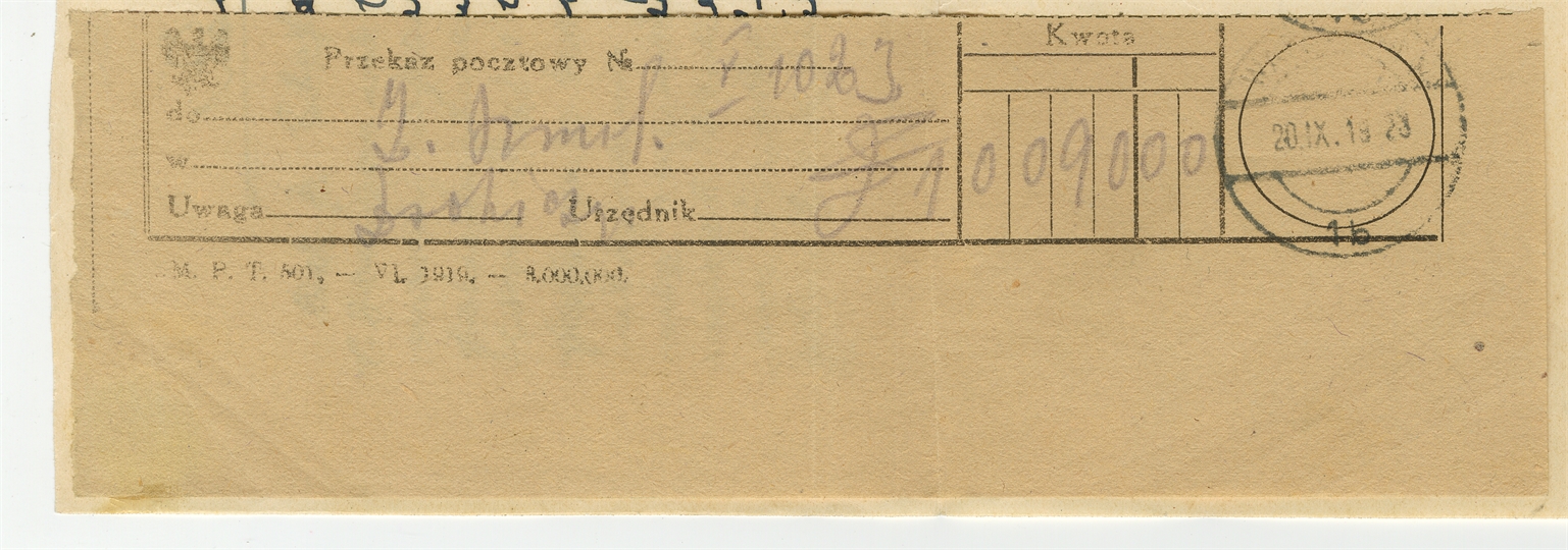 Dowód nadania przekazu pocztowego do Z. Szmita z dnia 29 IX 1923 roku