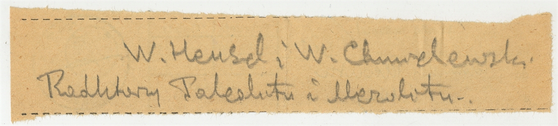 Dowód nadania przesyłki nr 821z dn. do kierownika paleolitu z notatką na odwrocie: Redaktorzy paleolitu i mezolitu W. Hensel i W. Chmielewski