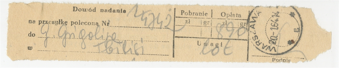 Dowód nadania przesyłki poleconej do T. Grigolija w Tbilisi z dnia 20.01.[19]64 roku