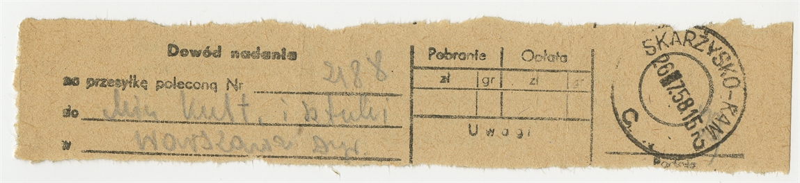Element 1 - Dowód nadania przesyłki poleconej nr 2188 z dn. 26 VII [19]58 r. - awers