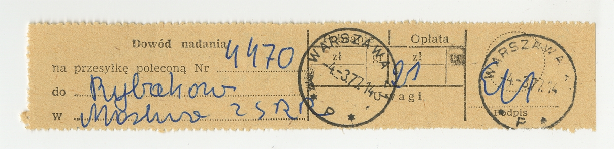 Dowód nadania przesyłki poleconej nr 4470 z dn. 14 III [19]77 r.