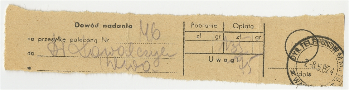 Element 1 - Dowód nadania przesyłki poleconej nr 46 z dn. 2 VIII [19]58 r. - awers