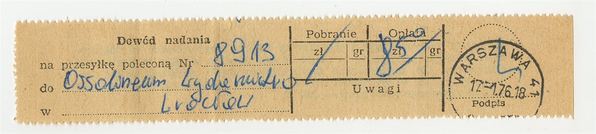 Dowód nadania przesyłki poleconej z dn. 12 I [19]76 r. - awers