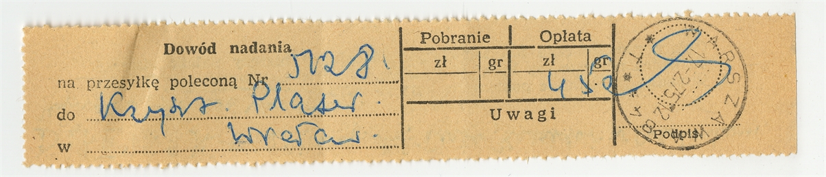 Element 1 - Dowód nadania przesyłki poleconej z dn. 17 II [19]75 r. - awers