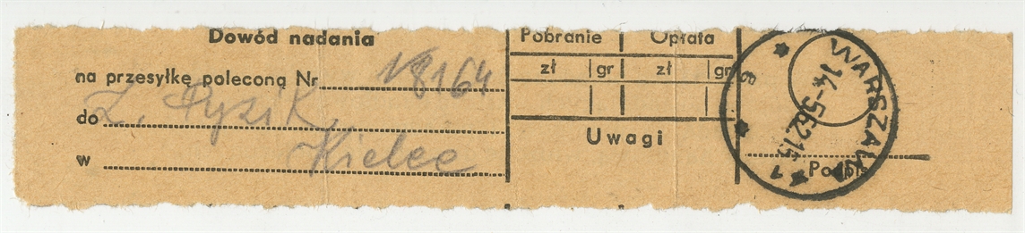 Dowód nadania przesyłki poleconej z dnia 14.05 [19]62 roku do Z. Pyzika w Kielcach - awers