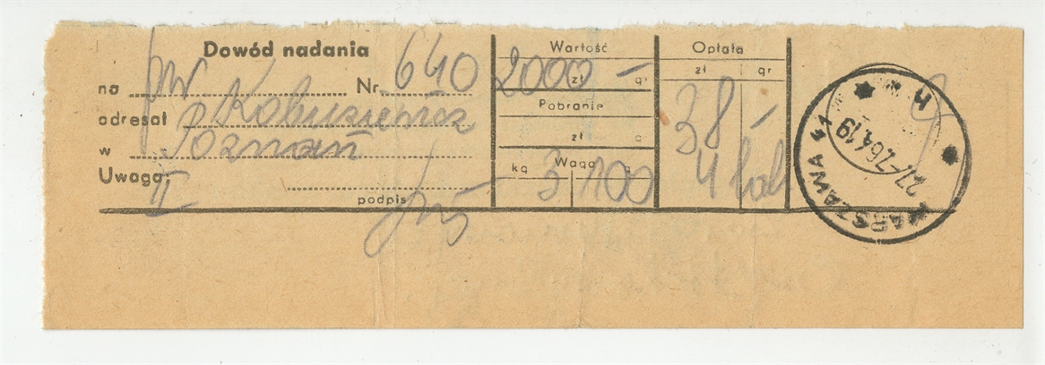 Dowód nadania przesyłki wartościowej do Michała Kobusiewicza z dnia 27 VII [19]64 roku - awers