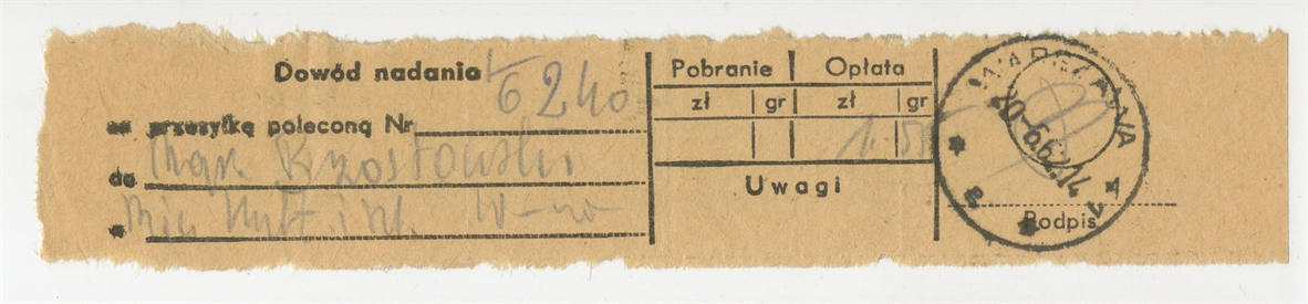 Dowód nadania w dniu 20.06.1962 roku listu prof. Stefana Krukowskiego napisanego do mgr Brzostowskiego