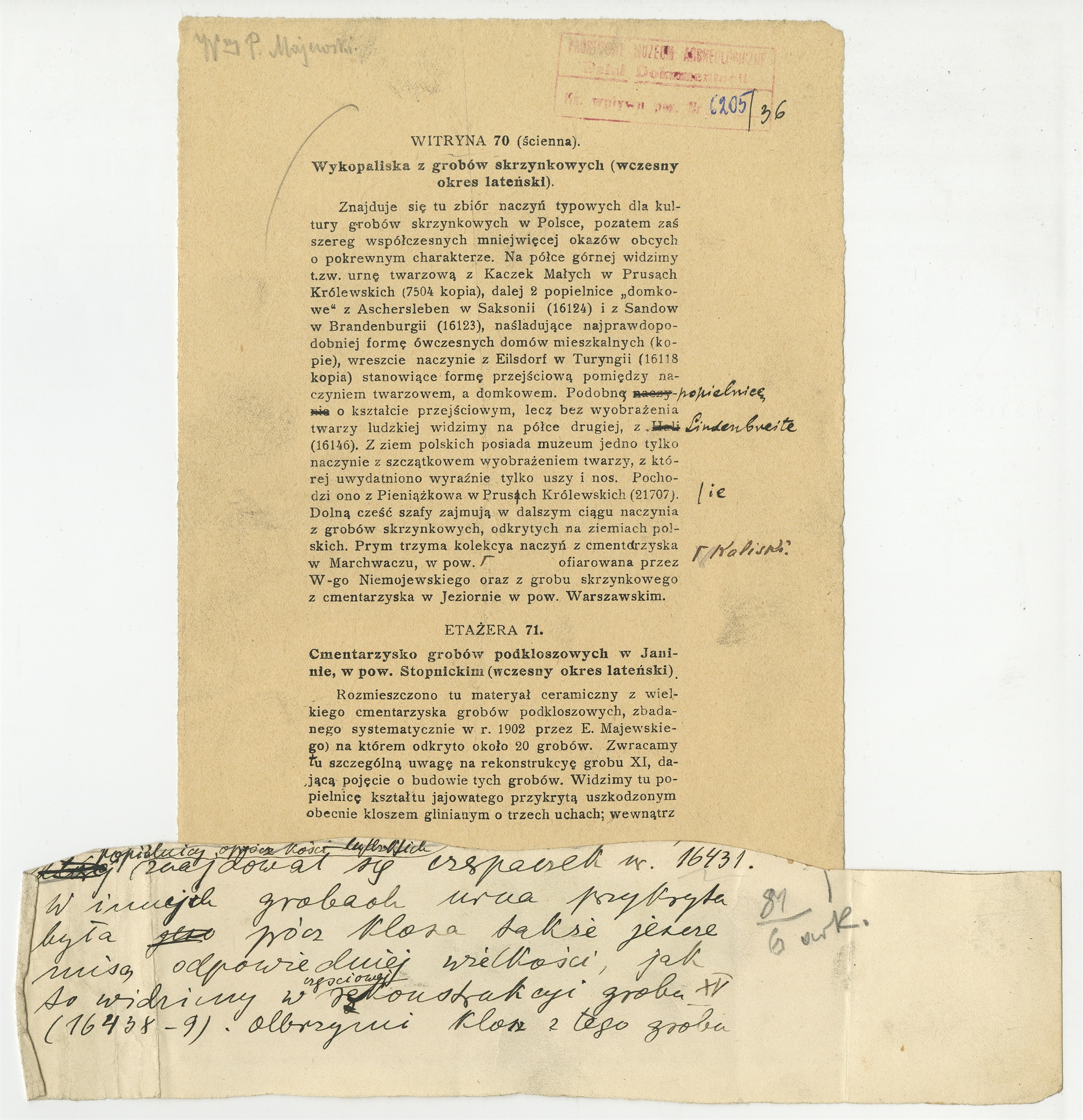 Druk - kartka z katalogu MEM z opisem witryny 70 i etażery 71 wraz z doklejonym fragmentem rękopisu - uzupełnieniem opisu etażery 72