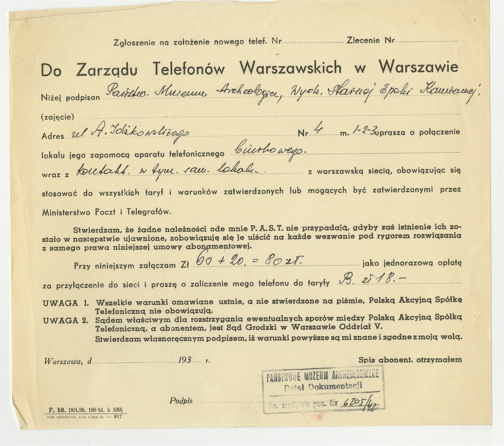 Druk Zarządu Telefonów Warszawskich - zgłoszenie nowego telefonu częściowo wypełnione ręką NN