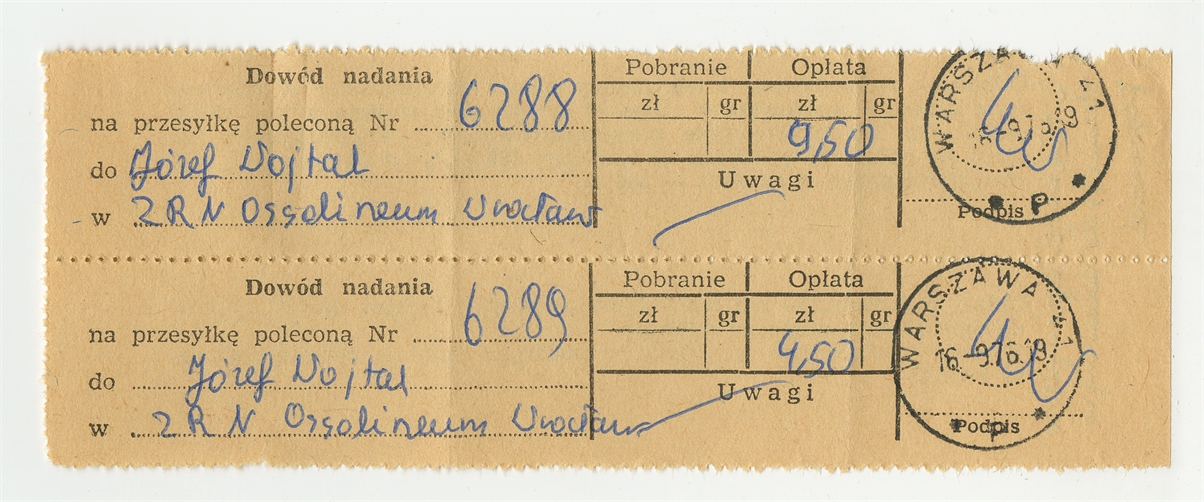 Dwa dowody nadania przesyłki poleconej z dn. 16 IX [19]76 r.