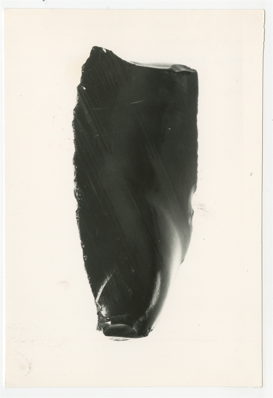 Fotografia czarnobiała autorstwa Tadeusza Biniewskiego - "kłatyc dwułupny" pochodzący z Wysp Salomona ze szkliwa wulkaniczniego (?).