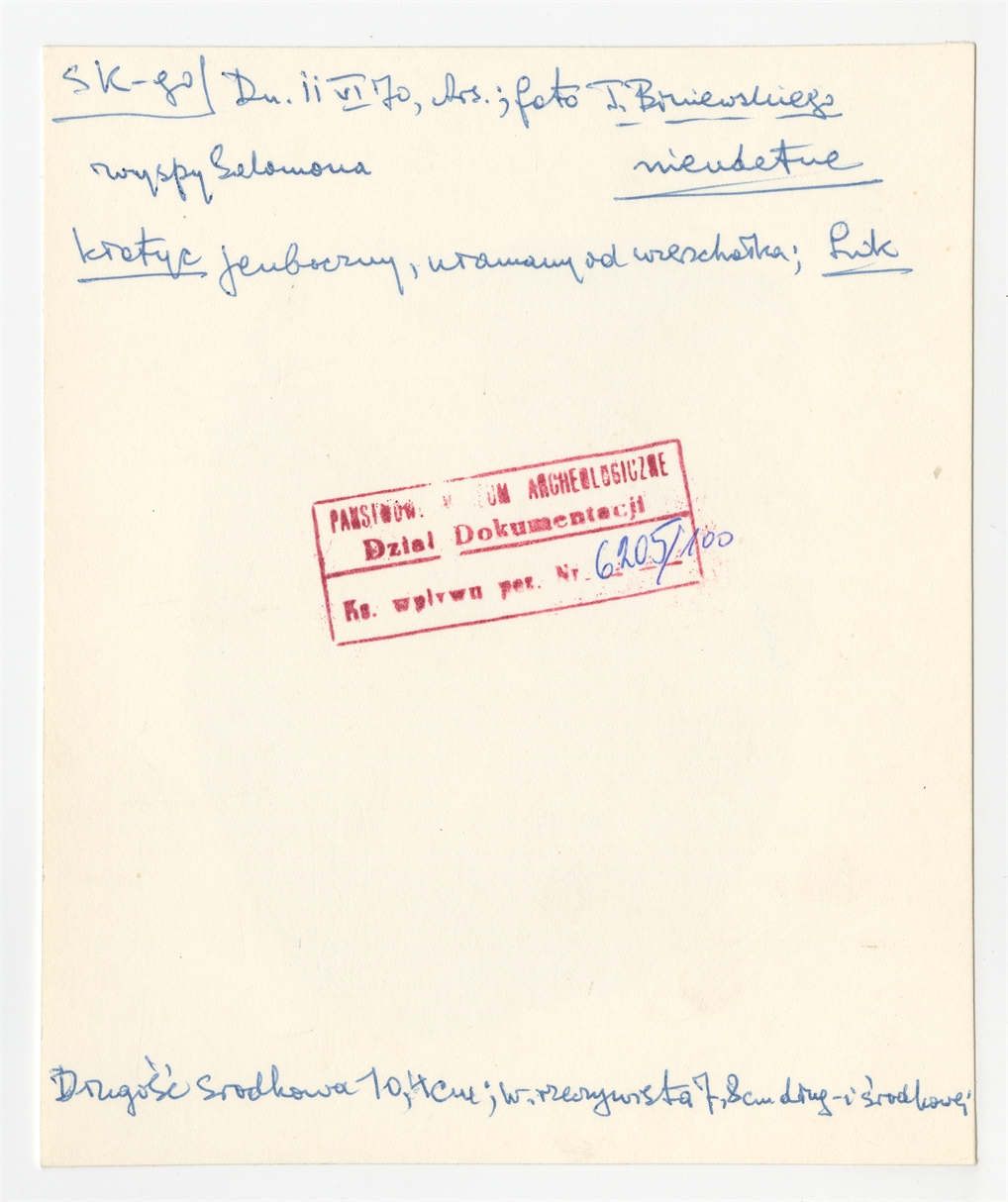 Fotografia czarnobiała autorstwa Tadeusza Biniewskiego - "kłatyc" pochodzący z Wysp Salomona ze szkliwa wulkaniczniego (?) - opis S. Krukowskiego