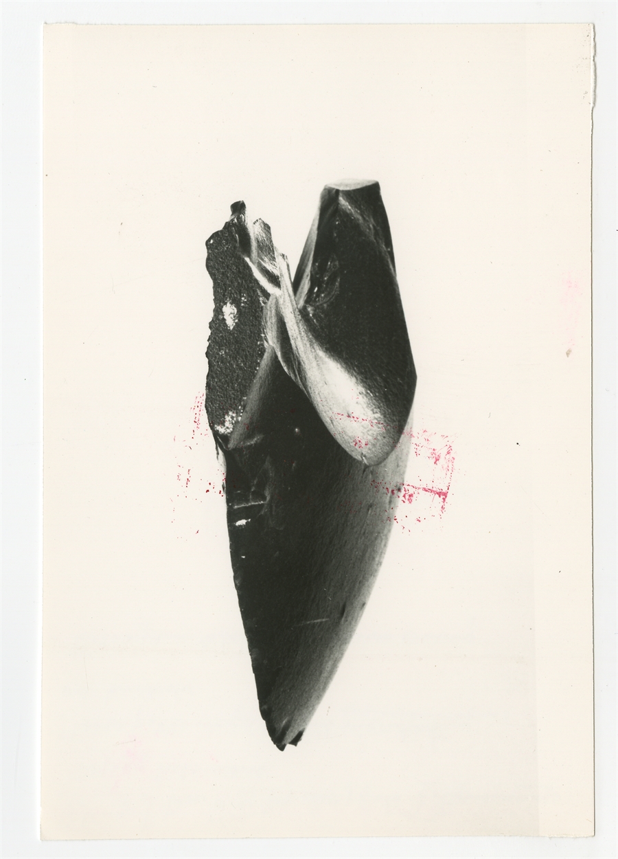 Fotografia czarnobiała autorstwa Tadeusza Biniewskiego - "torco półtowe" pochodzący z Wysp Salomona ze szkliwa wulkaniczniego (?).