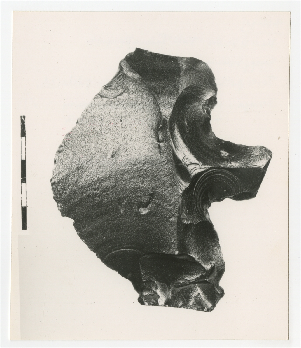Fotografia czarnobiała autorstwa Tadeusza Biniewskiego - "torco połtowe" pochodzący z Wysp Salomona ze szkliwa wulkaniczniego (?).