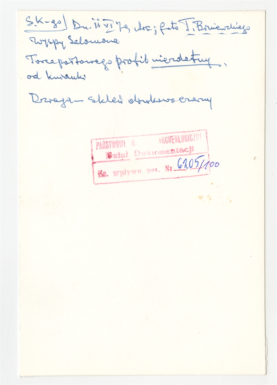 Fotografia czarnobiała autorstwa Tadeusza Biniewskiego - "torco półtowe" pochodzący z Wysp Salomona ze szkliwa wulkaniczniego (?) - opis S. Krukowskiego