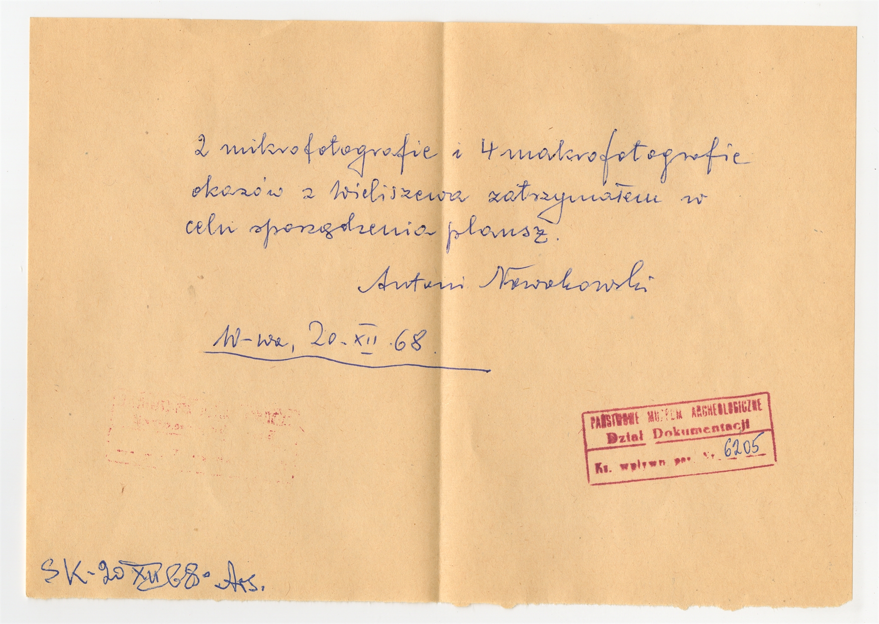Fotografie dotyczące Wieliszewa (od dr A. Nowakowskiego) - koperta zatytułowana "Fotografie zatrzymane u dr. A. Nowakowskiego" - strona 1: Rękopis notatki sporządzonej przez Antoniego Nowakowskiego wraz z datą autorstwa S. Krukowskiego "2 mikrofotografie" ... "sporządzenia plansz" W-wa 20 XII [19]68