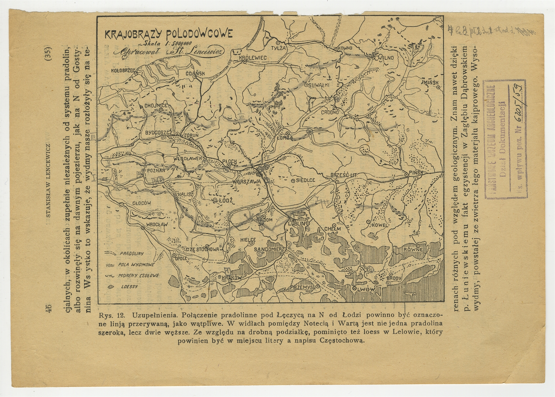 Fragment publikacji Stanisława Lencewicza z mapką zatytułowaną "Krajobrazy polodowcowe" - strona 1