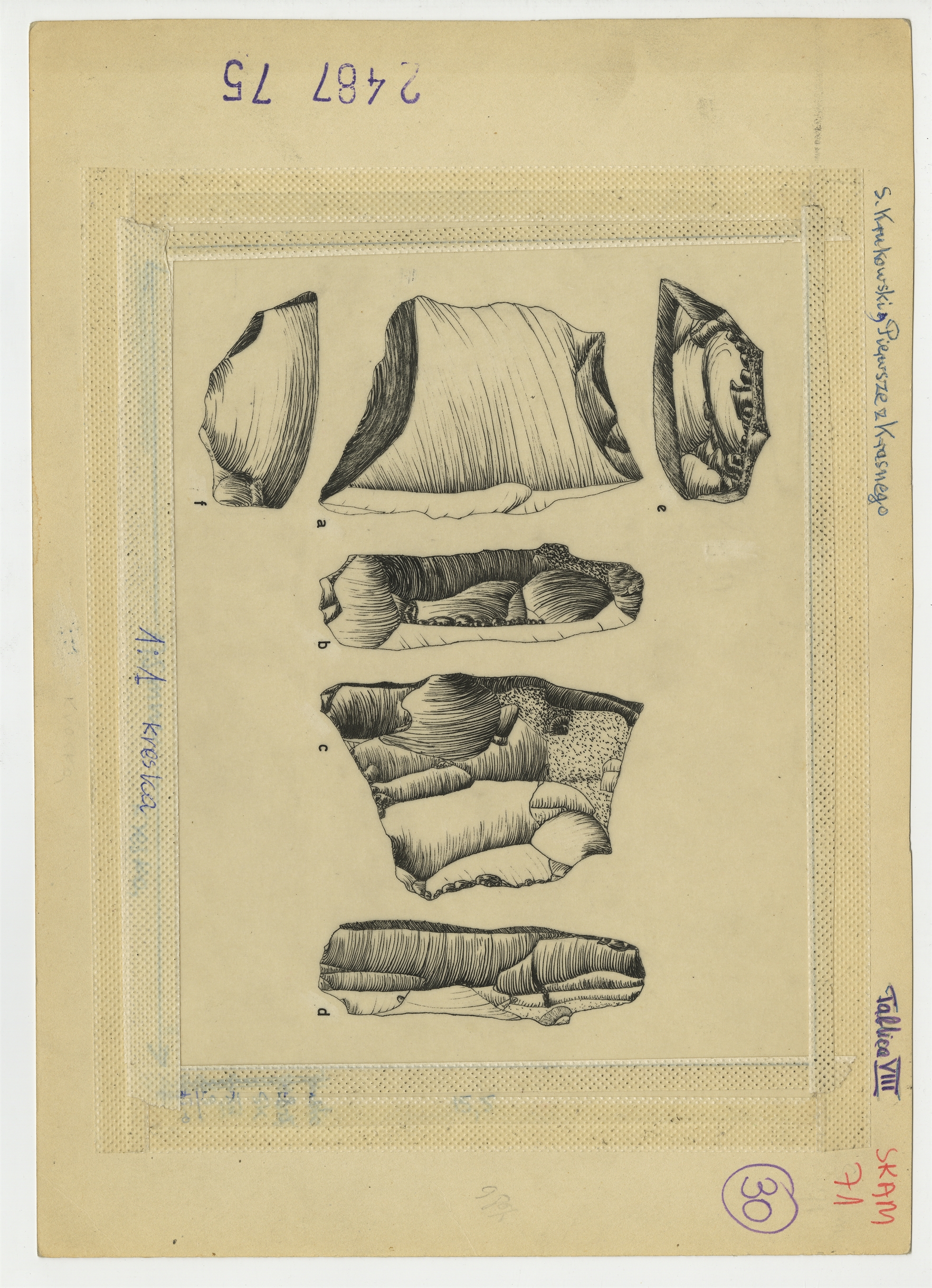 Ilustracje do "Skama 71" - Tablica VIII z rysunkami krzemieni tuszem na kalce zatytułowana: S. Krukowski "Pierwsze z Krasnego"