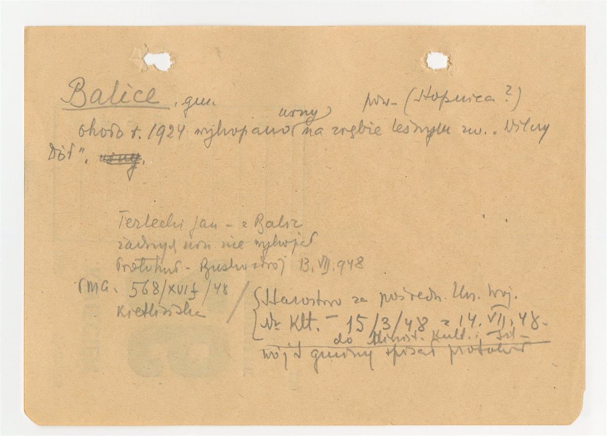 Karta "Balice gm. [brak danych] pow. (Stopnica?)" (rękopis) z kartoteki Michała Drewki dotyczącej jego działalności konserwatorskiej - strona 1