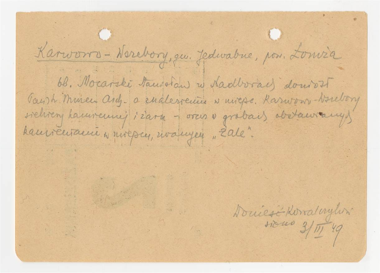 Karta "Karwowo-Wszebory gm. Jedwabne pow. Łomża" (rękopis) z kartoteki Michała Drewki dotyczącej jego działalności konserwatorskiej - strona 1