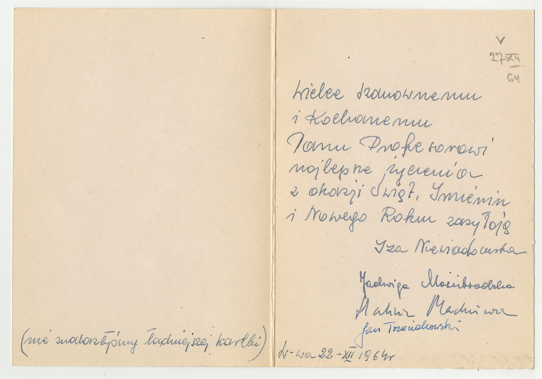 Karta okolicznościowa od Izy Niewiadomskiej (i inn.) do Stefana Krukowskiego z dnia 22 XII 1967 podpisy 4 osób: Iza Niewiadomska Jadwiga Mościbrodzka Halina Mackiewicz i Jan Trzeciakowski