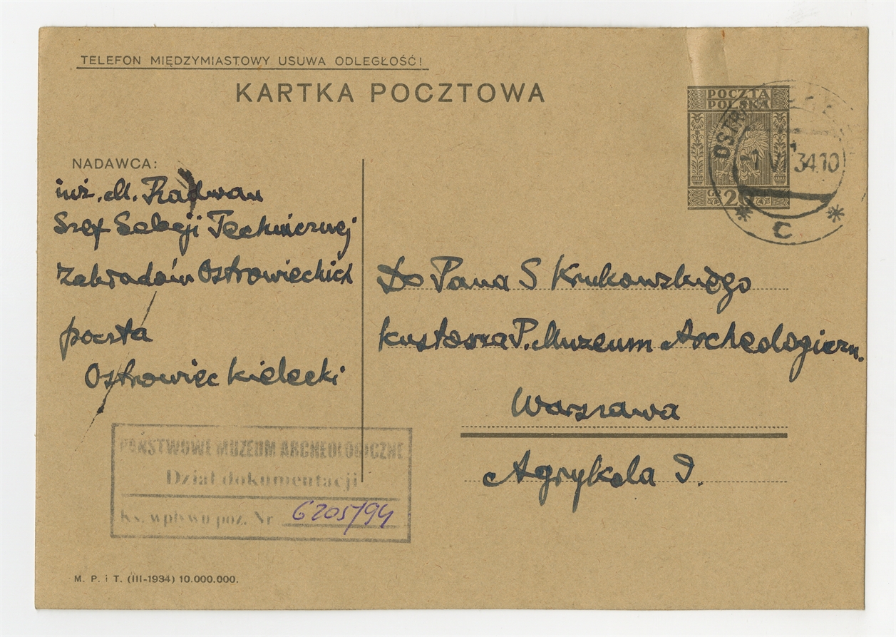 Karta pocztowa od inż. M. Radwana do prof. Stefana Krukowskiego Ostrowiec 31 V 1934 r. - awers
