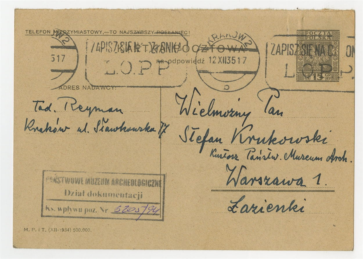 Karta pocztowa od Tad. Reymana do prof. Stefana Krukowskiego Kraków 12 XII 1935 r. - strona z adresem