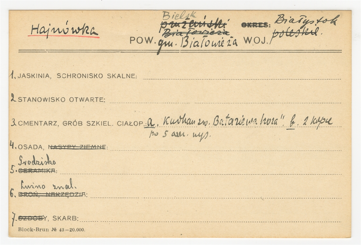 Karta stanowiska "Hajnówka gm. Białowieża pow. Bielsk woj. Białystok" (druk rękopis) - strona 1