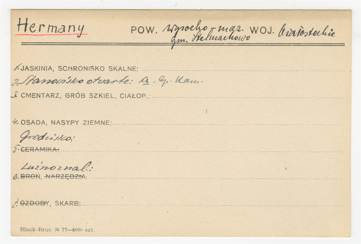 Karta stanowiska "Hermany gm. Stelmachowo pow. Wysocko-maz. woj. białostockie" (druk rękopis) - strona 1