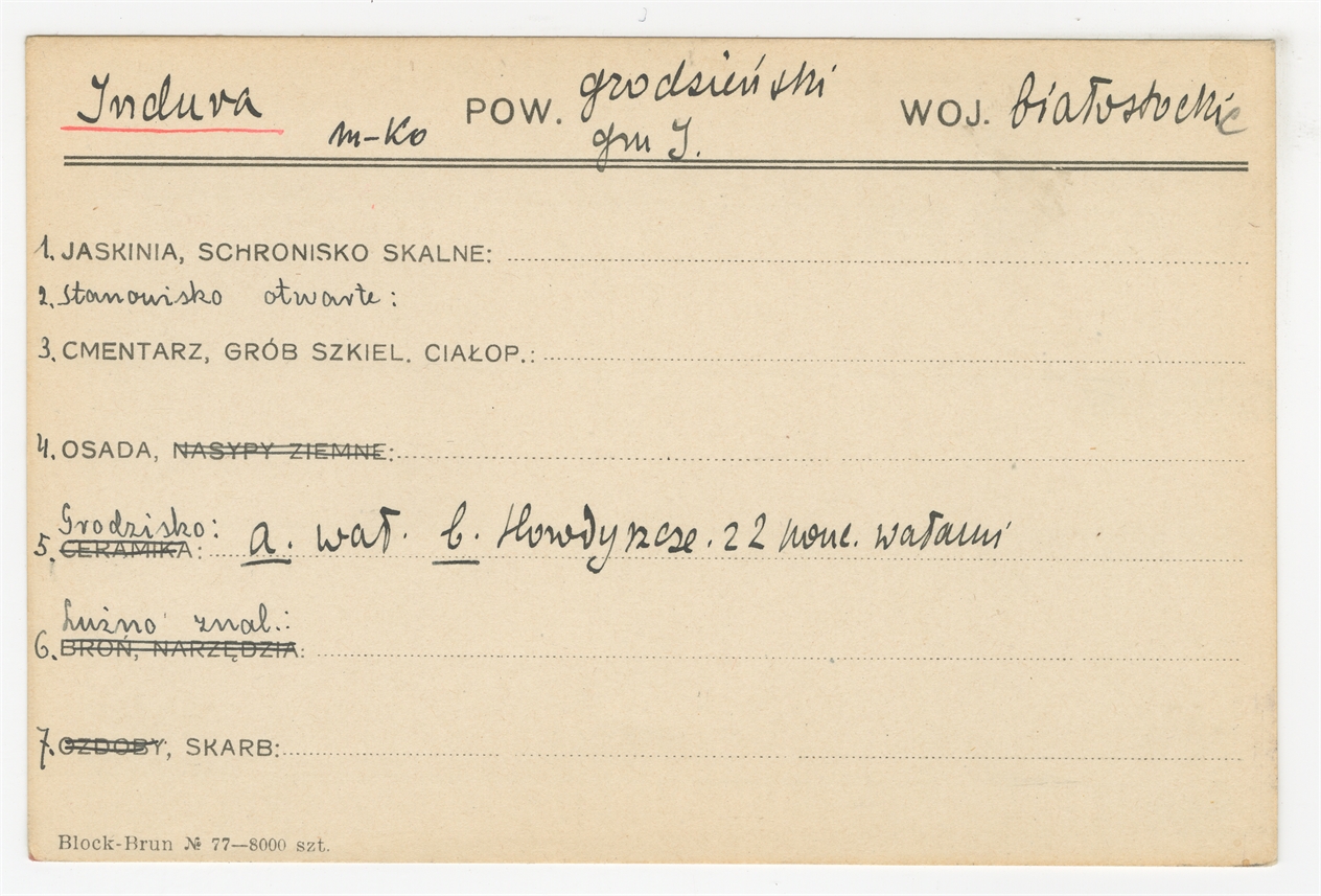 Karta stanowiska "Indura gm. I. pow. grodzieński woj. białostockie" (druk rękopis) - strona 1