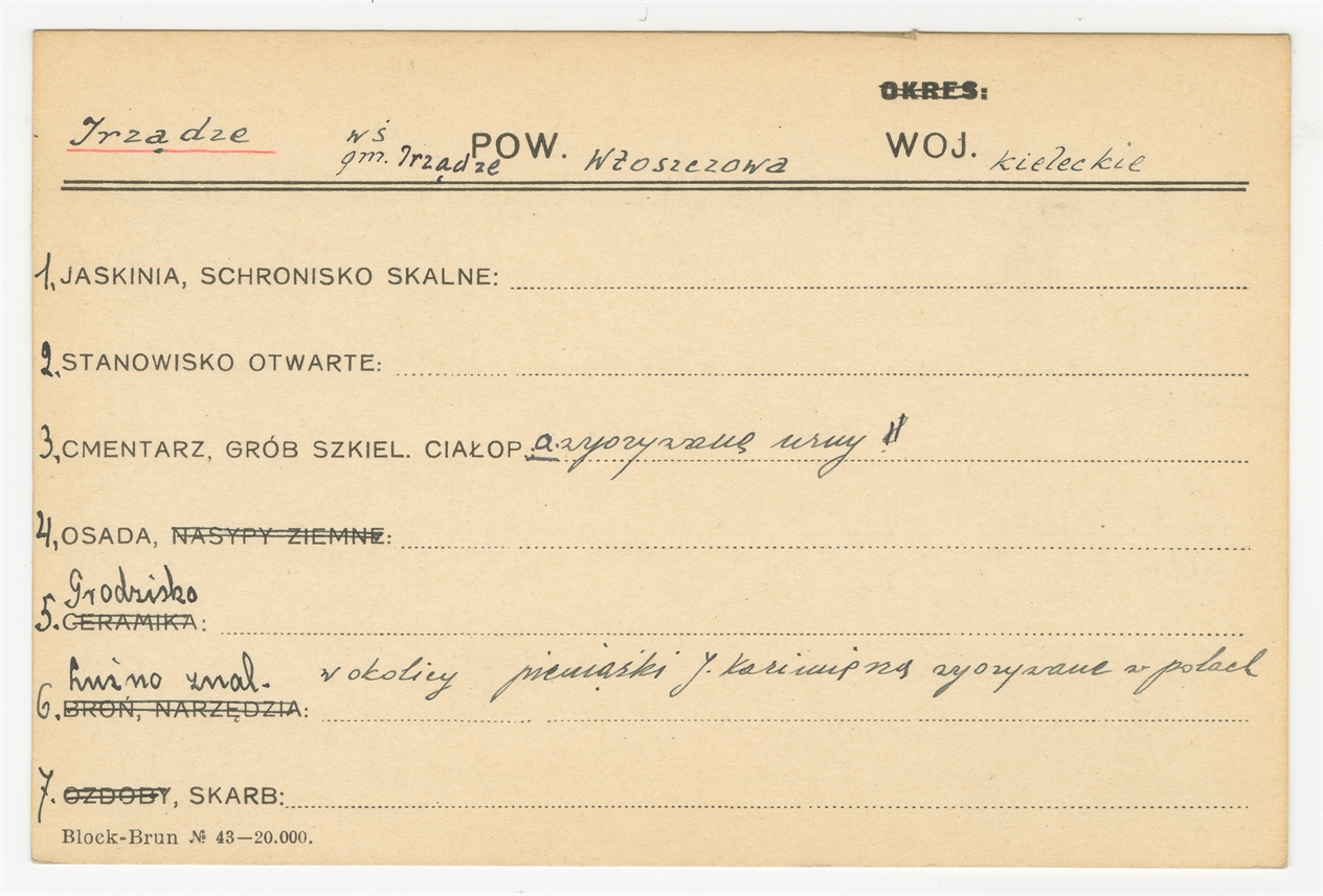 Karta stanowiska "Irządze gm. Irządze pow. Włoszczowa woj. kieleckie" (druk rękopis) - strona 1