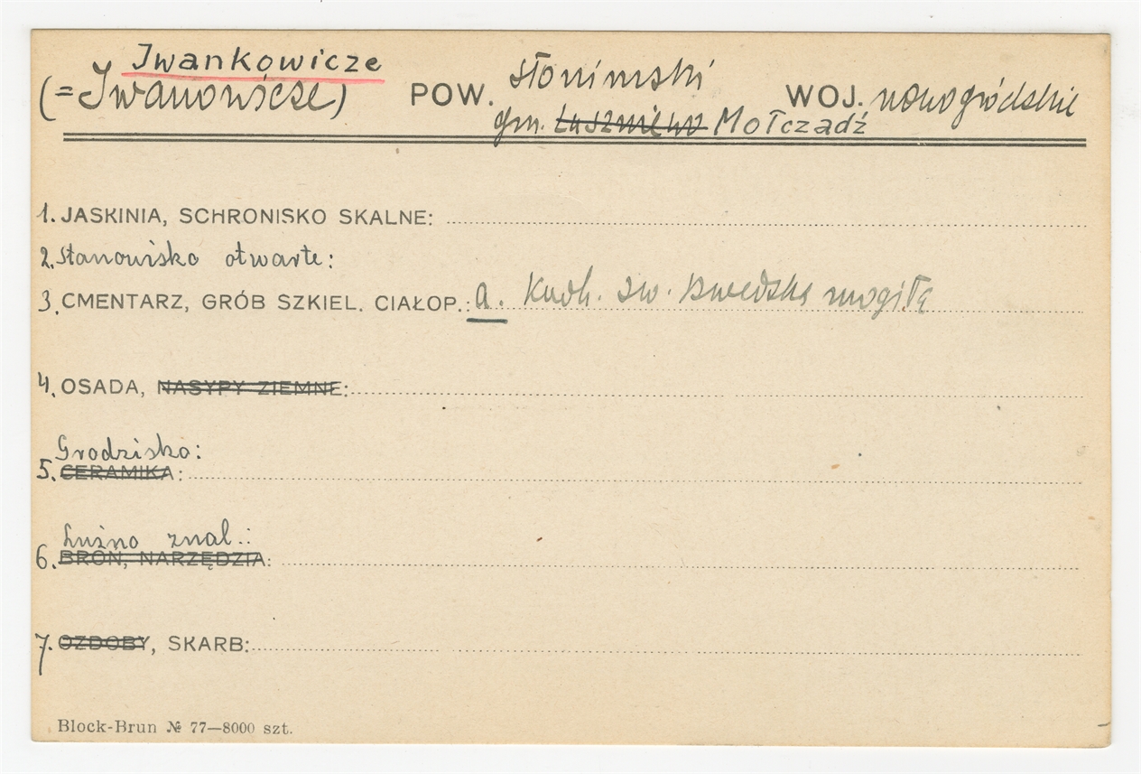 Karta stanowiska "Iwankowicze (=Iwanowicze) gm. Mołczadź pow. słonimski woj. nowogródzkie" (druk rękopis) - strona 1