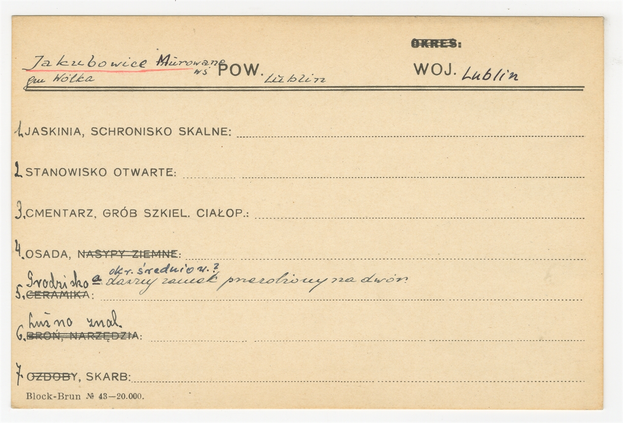 Karta stanowiska "Jakubowice Murowane gm. Wólka pow. Lublin woj. Lublin" (druk rękopis) - strona 1