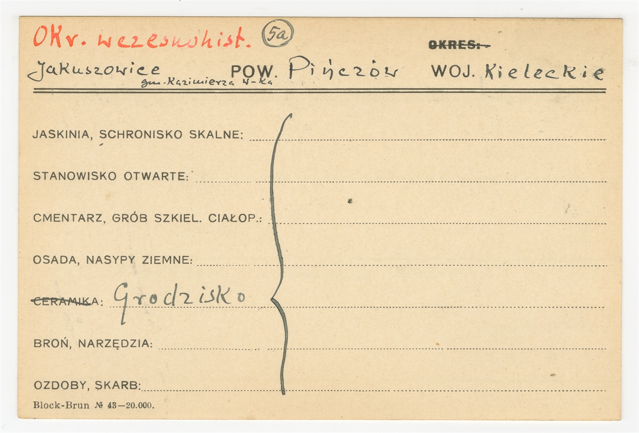 Karta stanowiska "Jakuszowice gm. Kazimierza W-ka pow. Pińczów woj. Kieleckie" (druk rękopis) - strona 1