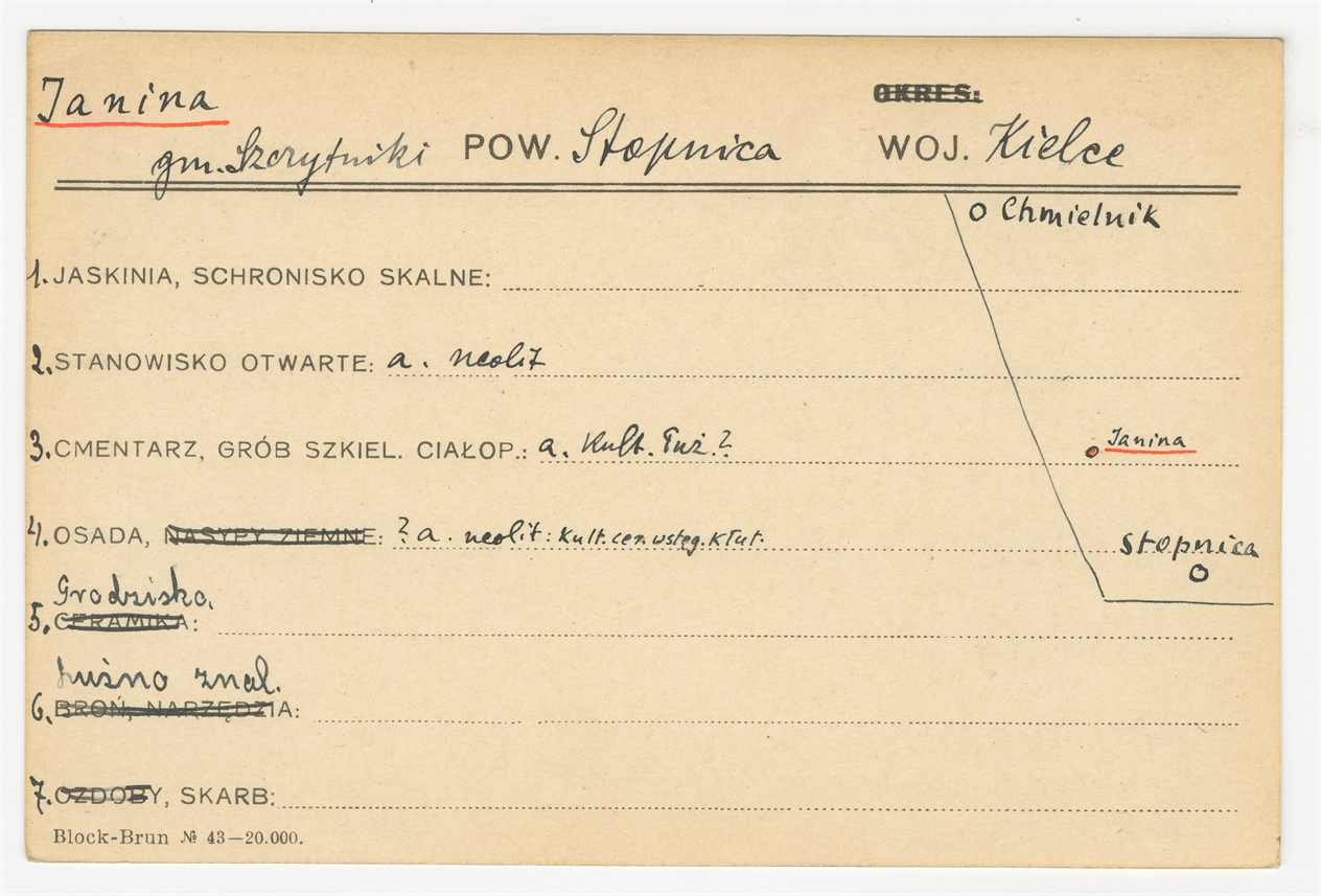 Karta stanowiska "Janina gm. Szczytniki pow. Stopnica woj. kieleckie" (druk rękopis) - strona 1