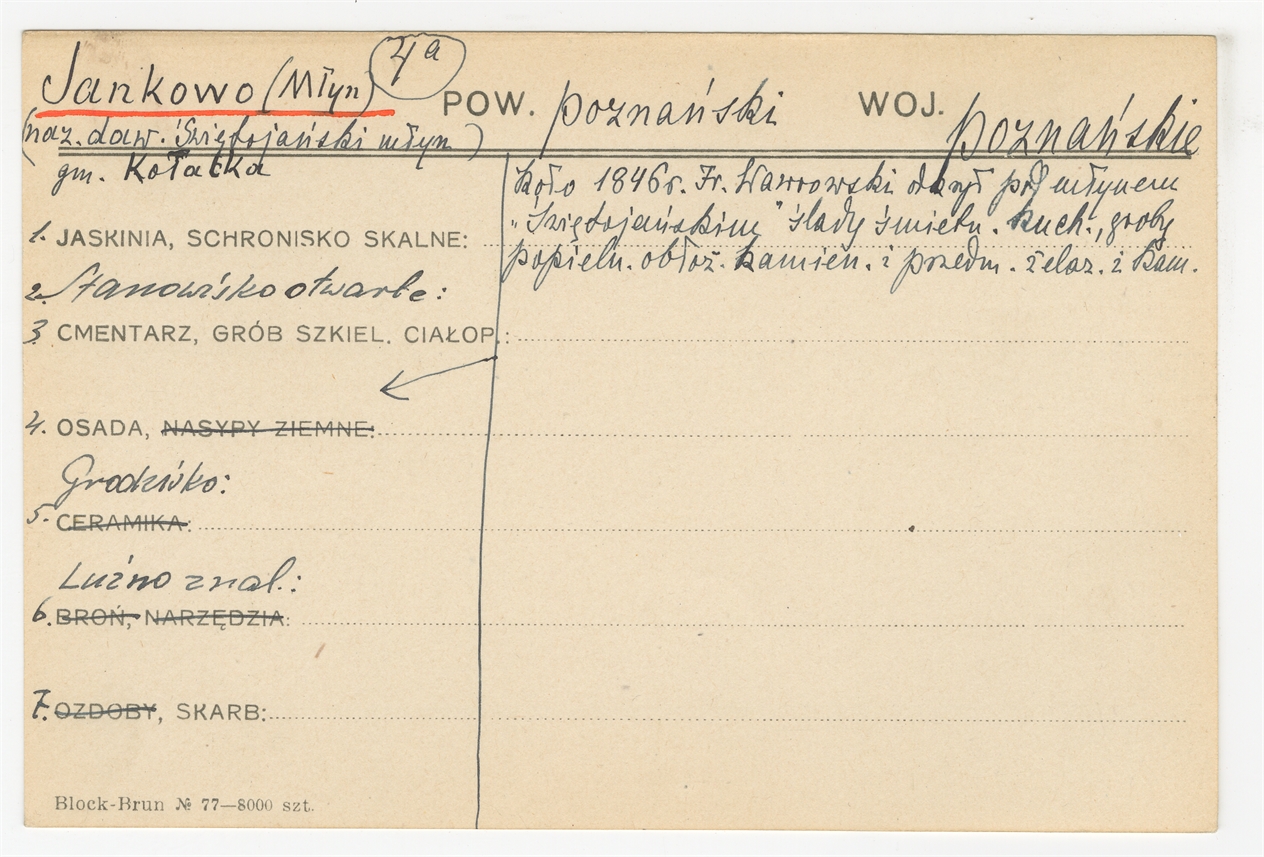 Karta stanowiska "Jankowo (Młyn) gm. Kołatka pow. Poznański woj. poznańskie" (druk rękopis) - strona 1
