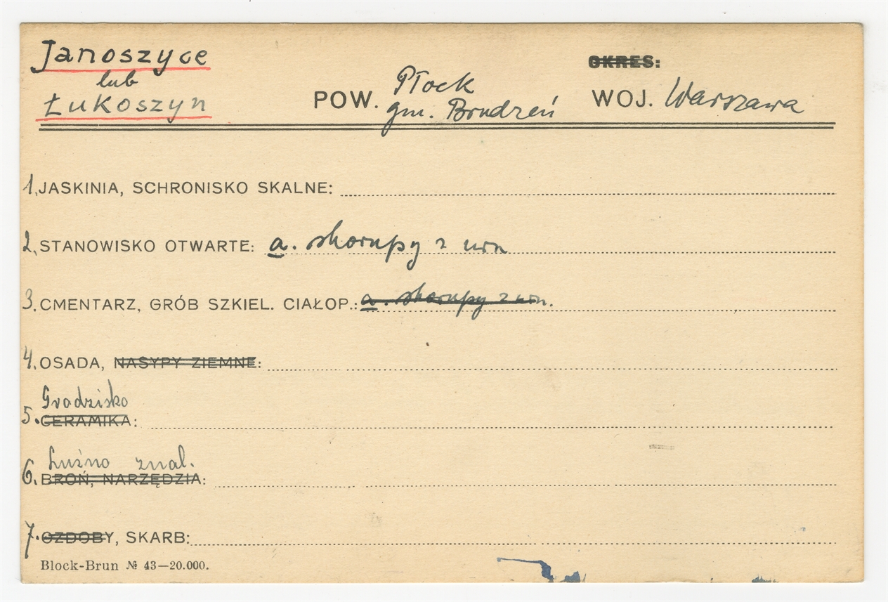 Karta stanowiska "Janoszyce lub Łukoszyn gm. Brudzeń pow. Płock woj. Warszawa" (druk rękopis) - strona 1
