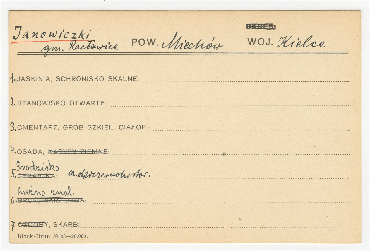 Karta stanowiska "Janowiczki gm. Racławice pow. Miechów woj. Kielce" (druk rękopis) - strona 1